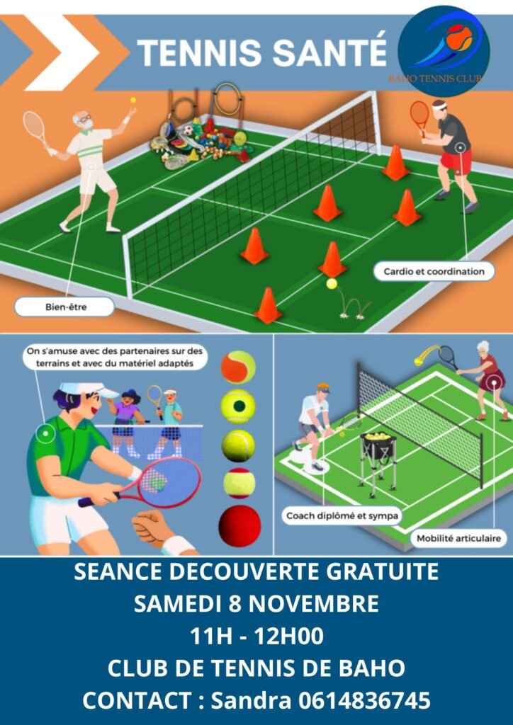 Venez découvrir le « Tennis Santé » lors d’une séance au Tennis Club de Baho le Samedi 8 novembre de 11h à 12h.