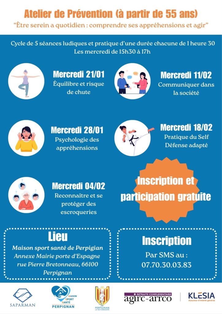 Nous organisons à Perpignan un cycle de 5 ateliers gratuits de prévention, à partir de 55 ans, pour se sentir plus serein au quotidien.
